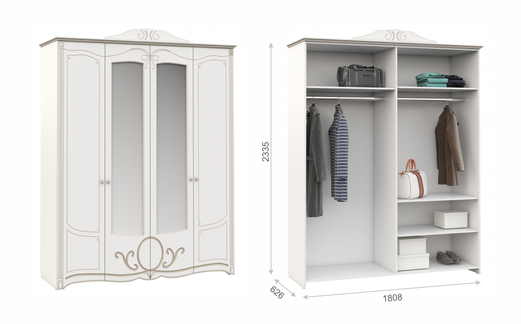 • Шкаф 4-х Створчатый: Ширина 1808 мм х Глубина 626 мм x Высота 2335 мм